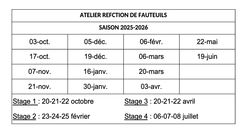 Les chaises ou les sièges très abîmés peuvent être dégarnis et consolidés avant les cours (pour gagner du temps). Ne jetez pas toutes les fournitures de l’ancienne garniture certaines choses peuvent être récupérées ( crin animal, très coûteux, il peut être lavé dans une taie d’oreiller bien fermée, programme délicat, ou à la main, parfois les ressorts peuvent resservir…).